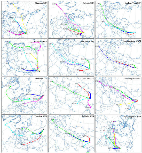 Clustering of backward trajectories in different seasons (DJF, MAM, JJA, and SON) at TS, BLH, and SJY stations (The asterisk represents the location of the station, and color is used to distinguish the clustering results of different trajectories).