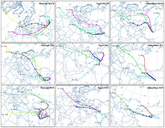 The HYSPLY model is employed to reconstruct the movement paths of moisture during precipitation events at six stations in NTP. The trajectories were clustered at various altitudes based on the seasons. In the case of NL, MZTG, and QLS, there are few samples in DJF, and these trajectories are clustered in MAM, JJA, and SON. The corresponding results are presented in Figure 7 and Figure 8.