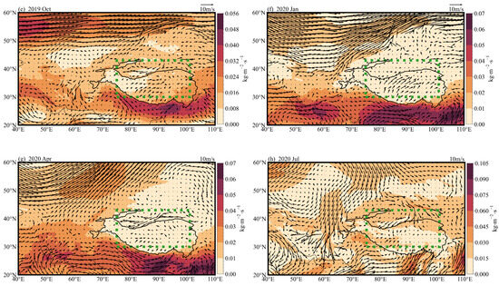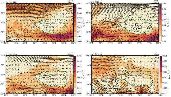 Monthly mean moisture flux (kg·m−2·s−1) and wind filed (m/s) at 850 pha in central Asia in October 2018, January, April, and July 2019 based on ERA-Interim reanalysis results from the European Centre for Medium-Range Weather Forecasts (ECMWF) (Note: The black arrow indicates the wind speed, and the green dotted sqaure indicates the area studied in this paper).
