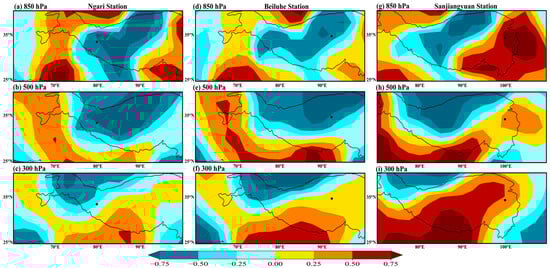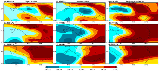 The mean δ18O values of TS (−17.78‰), MZTG (−26.14‰), NL (−22.3‰), BLH (−16.51‰), and SJY (−16.4‰) in the winter half show a decreasing variation from north to south and an increasing variation from west to east, which is attributed to the gradual precipitation process resulting from moisture transported over long distances by the westerly wind. The lower mean δ18O values in DJF at MZTG (−28.8‰) and BLH (−22.09‰) compared to other stations may be associated with lower condensation temperatures at higher altitudes. In contrast, the δ18O values at both stations show higher values in JJA (MZTG: −3.48‰; BLH: −7.33‰) due to a more localized moisture cycle with rising temperatures, and the strong evaporation leads to the depletion of moisture in surface water, entering the atmosphere and participating in precipitation. Gui et al. suggest that recirculating vapor contributes more to the atmosphere at higher altitudes due to the weak sub-cloud evaporative effect [27]. Additionally, the δ18O value of JJA in SJY (−10.9‰) located at the edge of the monsoon with the most depleted moisture of the six stations may be influenced by the monsoon carrying the marine air mass. Sun and Wang used the FLEXPART model to trace the source of moisture in the headwaters of the three rivers and found that moisture from the Bay of Bengal and Arabia, carried by the southwest monsoon, and from the Pacific, carried by the East Asian monsoon, can reach this region during JJA [68].
