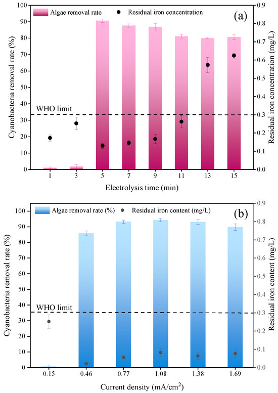 The removal efficiency of M. aeruginosa and variations in residual iron with different electrolysis times (a) and with different current densities (b). Initial cyanobacteria cell density: 2.48 × 106 cells·mL−1; electrode distance of 2.0 cm; electrolyte: 2.0 mM Na2SO4; aeration rate: 0.06 L·min−1, static settling time: 25 min; (a) current density: 0.46 mA/cm2; (b) electrolysis time: 5 min.