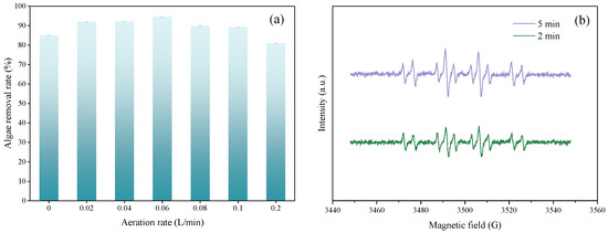 The removal efficiency of M. aeruginosa with different aeration rates (a). EPR spectra of DMPO-⋅OH for Fe-GF system at different electrolysis times (b). Initial cyanobacteria cell density: 2.48 × 106 cells·mL−1; electrode distance of 2.0 cm; electrolyte: 2.0 mM Na2SO4; current density: 1.08 mA/cm2; (a) electrolysis time: 5 min, static settling time: 25 min; (b) aeration rate: 0.06 L·min−1.