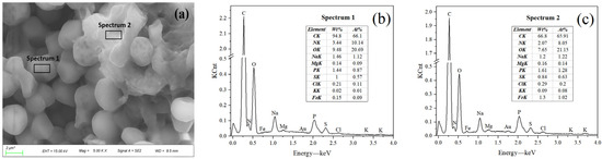 SEM-EDX analysis of the cyanobacterial flocs produced by EC-EF. SEM micrograph of cyanobacterial floc (a); EDX analysis of elemental compositions on the cyanobacteria cells (b) and on the agglutinant (c). Experimental conditions: Initial cyanobacteria cell density: 2.48 × 106 cells·mL−1; current density: 1.08 mA/cm2; electrolysis time: 5 min; electrode distance of 2.0 cm; electrolyte: 2.0 mM Na2SO4; aeration rate: 0.06 L·min−1, static settling time: 25 min.