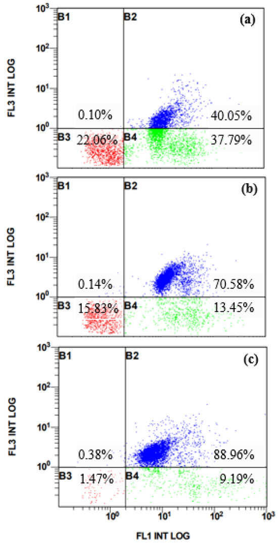 Flow cytometry results of M. aeruginosa with 5 min (a), 7 min (b), and 9 min (c) electrolysis times. Initial cyanobacteria cell density: 2.48 × 106 cells·mL−1; current density: 1.08 mA/cm2; electrode distance of 2.0 cm; electrolyte: 2.0 mM Na2SO4; aeration rate: 0.06 L·min−1.
