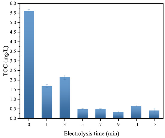 The changes in TOC content in the supernatant of cyanobacterial fluid after treatment with different electrolysis times. Initial cyanobacteria cell density: 2.48 × 106 cells·mL−1; current density: 1.08 mA/cm2; electrode distance of 2.0 cm; electrolyte: 2.0 mM Na2SO4; aeration rate: 0.06 L·min−1, static settling time: 25 min.