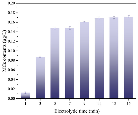 The changes in MC content in the supernatant of cyanobacterial fluid after treatment with different electrolysis times. Initial cyanobacteria cell density: 2.48 × 106 cells·mL−1; current density: 1.08 mA/cm2; electrolysis time: 5 min; electrode distance of 2.0 cm; electrolyte: 2.0 mM Na2SO4; aeration rate: 0.06 L·min−1, static settling time: 25 min.