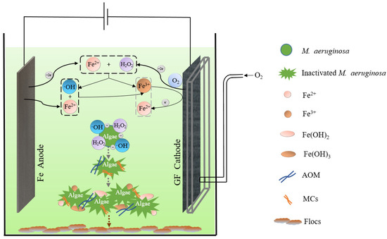 Cyanobacterial-laden water is a heterogeneous system. The process and mechanism in this EC-EF system to remove cyanobacteria are different from those of a homogeneous system. The schematic diagram in Figure 7 shows the processes of EC-EF for removal of cyanobacteria. In the system, the iron acts as a sacrificial anode, releasing Fe2+ into solution (Equation (2)), which is the initial source of a range of iron species in the system.