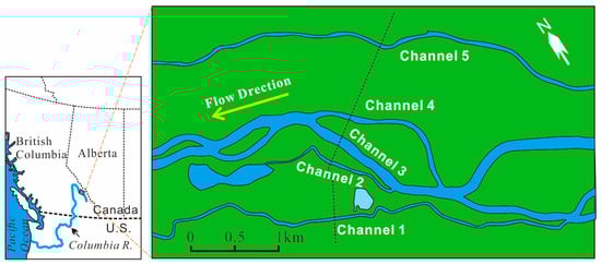 - Makaske, B.; Smith, D.G.; Berendsen, H.J.A.; de Boer, A.G.; van Nielen-Kiezebrink, M.F.; Locking, T. Hydraulic and sedimentary processes causing anastomosing morphology of the upper Columbia River, British Columbia, Canada. Geomorphology 2009, 111, 194–205. [Google Scholar] [CrossRef]