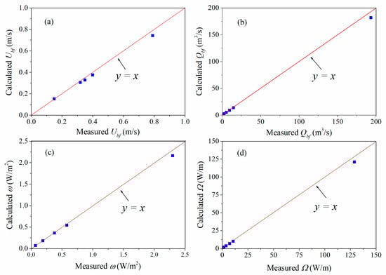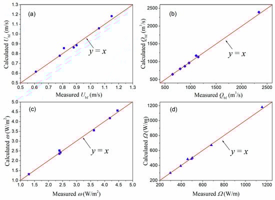 | Gauging Stations | n | Sc | Um (m/s) | Uc (m/s) | Qm (m3/s) | Qc (m3/s) | ωm (W/m2) | ωc (W/m2) | Ωm (W/m) | Ωc (W/m) |