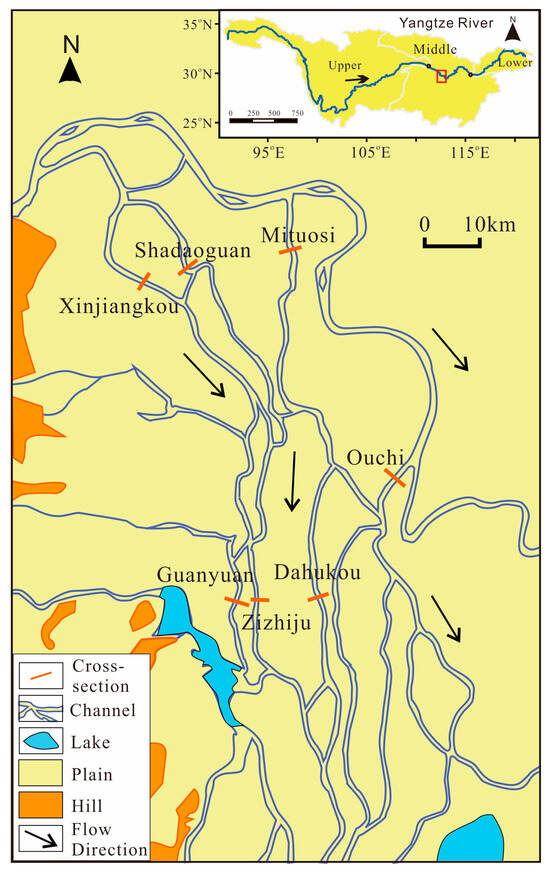 - Wang, S.; Chen, Z.; Smith, D.G. Anastomosing river system along the middle Yangtze River Basin, Southern China. Catena 2005, 60, 147–163. [Google Scholar] [CrossRef]
