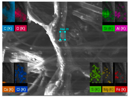 High concentrations of Cl and Ca, distributed on the surface of PP fibers, were identified in Sample P1 of Section 3, with 4.96% for Cl and 21.30% for Ca (Figure 11 and Figure 12).