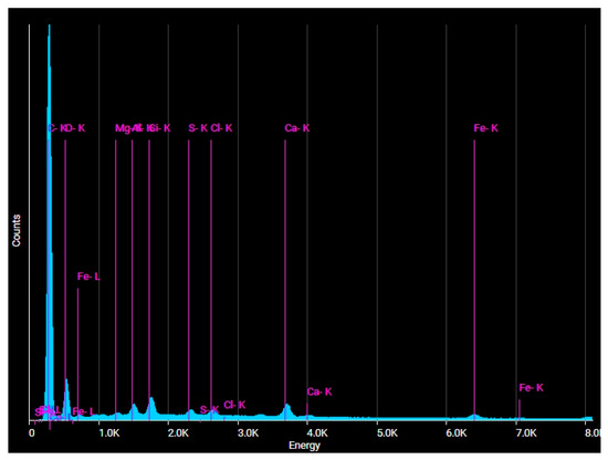 Based on the EDS analysis, as can be seen in Figure 6, the spectrum relates the intensity of the emitted X-rays according to the energy of the identified chemical elements.