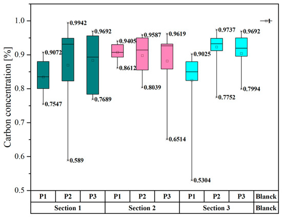 The PP filter cartridge consists of three carbon atoms and six hydrogen atoms [22]. Thus, the concentration of C has the greatest weight compared to the other identified chemical elements, where it appears that the C content is an integral part of the structure of the PP filter material [21]. The concentration of C is not part of the composition of the solid suspensions stuck to the fibers of the PP filter material. Analyzing the concentration of C at the level of each section, relatively minor differences can be observed between them. In Section 2, the maximum average value of the total C concentration was identified at 89.57%, followed by Section 3 with 88.39%. On the other hand, the minimum average total C concentration was identified in Section 1, at 86.27%, which does not differ much from Sections 2 and 3. In the blank sample, the highest C content was found (100%), followed by Section 1 Sample P2 with 99.42%. The lowest level was identified in the case of Section 3 of Sample P1, with a maximum average value of 90.25%. This difference can be explained by the fact that the level of solid suspensions is higher. In the case of Section 1, the median tends to increase from the value of 83.4% (in sample P1) to the value of 88.37% (in sample P3), followed by Section 2, where the median value decreases from Sample P1 (90.1%) to Sample P3 by (88.18%), and finally, this fluctuation of the median tends to increase in Section 3, from sample P1, with 82.46%, to sample P3, with 90.4%.