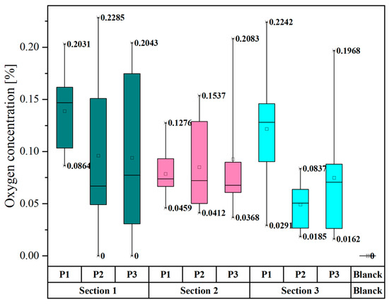 In the case of the oxygen concentration graphically represented in Figure 8, it can be seen that it differs from one section to another, so the maximum is found in Sample P2 at Section 1, with 22.85%, and the lowest level is found in Sample P2, at Section 3, with 8.37%. As can be seen, in addition to the blank sample (0%), the minimum average (0%) was also identified in Samples P2 and P3 from Section 1, followed by 1.62% in Sample P3 from Section 3. As in in the case of the C content, the average maximum values of the oxygen concentrations detected by EDS-SEM on the PP filter material were determined. So the highest content of O was identified in Section 1, with a total average of 10.97%. In the case of Sections 2 and 3, the total average values were closer, at 8.55% and 8.19%, respectively. The variation of the median concentration of O at the level of each section tended to fluctuate downward from Sample P1 of Section 1, followed by an increase from Sample P3 of Section 2 to Sample P1 of Section 3, where this variation subsequently decreased in Sample P2 and increased in the case of Sample P3 from the same section.