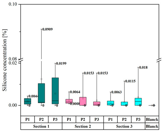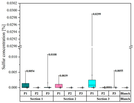 The average sulfur concentration, calculated by taking into account all sampling points carried out during the EDS-SEM analysis, showed that the highest S content was identified in Sample P1 from Section 3, 2.99%, followed by 1.08% in the case of Sample P1 in Section 1, according to Figure 9. Excluding the samples with 0% S content, in Sample P2 from Section 3, the lowest average concentration was identified, at 0.001%. The S content was lower compared to the other elements, and so the median values obtained varied very little, except for sample P1 in Section 3, which gave 0.4%. The variation was smaller as a result of the reduced volume of values obtained. A more intense distribution of Si solid suspensions was detected in sample P2 from Section 1, with a maximum of 9.09% (Figure 10). And the lowest average was identified in Sample P1 from Section 1, with 0.44%. The vast majority of samples taken from all sections of the PP filter cartridge showed a minimum average of 0%, except for Sample P1 in Section 2, where the minimum average value was 0.08%. As can be deduced from the maximum average value identified in Sample P2 from Section 1, the most representative total average value was also identified within the same section, with a 0.67% Si content. At the level of Sections 2 and 3, the total average values of the Si content were closer, at 0.26% and 0.22%, respectively.