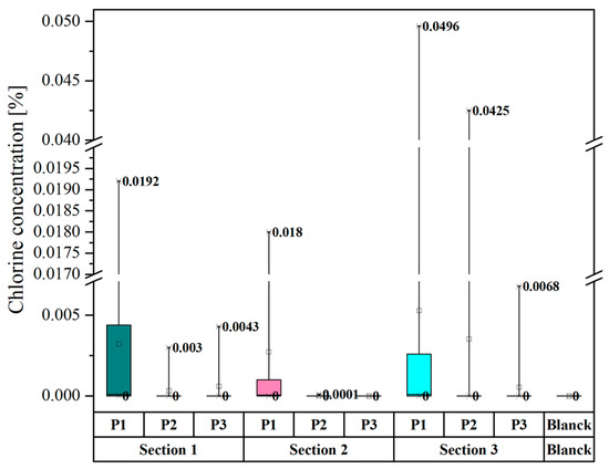 As can be seen in the graphs in Figure 11 and Figure 12, the distributions of the concentrations of Ca and Cl along the cartridge differed according to the retention process of the filter system. Alternatively, it should be mentioned that EDS was used to identify these two chemical elements, with Sample P1 from Section 3 having the highest concentration. In particular, the Cl content was reduced; this can also be observed in the graph in Figure 11, where the minimum average value is 0% in all samples. The variation in the median Cl content reduced; it varied from 0.001% in the case of Sample P2 from Section 2 to a maximum of 0.53% determined in Sample P1 from Section 3. According to the determinations of the total average Cl contents at the level of each section, it was found that the highest content was identified in Section 3, with 0.31%, followed by Section 1 with 0.14%, and the lowest total average value was determined at the level of Section 2, with 0.09%.