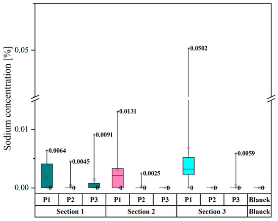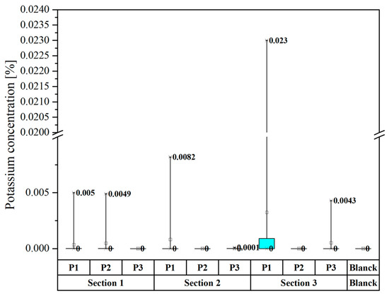 Figure 15 shows that the concentration of K was found at a maximum proportion of 2.03% in Sample P1 in Section 3, and in the opposite direction, several samples with 0% K were detected. As can be seen, the median variation tended to show very little fluctuation in Sections 1 and 2 across the three samples. The median fluctuation in Section 3 of sample P1 increased to 0.32% due to the increased volume of data from the EDS analysis, after which it fell for the remaining points in the section. The total mean of K concentration was equal in the cases of Sections 1 and 2, at 0.03%, and the most representative total mean value was determined at the level of Section 3, where 0.13% K concentration was obtained. This case is similar to the total average P concentration, in the context of which Sections 1 and 2 were equal.