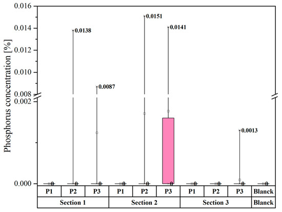 At the level of each section, the total average differed depending on the volume of data obtained and the ability of EDS to identify this chemical element on the surface of the PP filter. In this way, the lowest overall average was identified in Section 2, with 0.11% Na content, followed by 0.12% determined in Section 1. In another vein, the maximum overall average was identified in Section 3 with 0.24% Na content. Regarding P concentration, Sample P2 (Section 2) reported the most typical average at 1.51%, followed by Sample P3 in the same section, at 1.41%. The variance in P concentration is graphically depicted in Figure 13. Conversely, the lowest mean was identified in several samples as 0%. The presence of P increases the risk of compound deposition on the surface of a membrane or filter material [23]. The variation of the median P concentration is here very small due to the small volume of data obtained from the EDS-SEM analysis. When it comes to Sections 1 and 2, where the average P concentration variation was 0.12%, and Section 3, where the average was 0%, the P concentration variation found at each level of the PP filter cartridge can be inferred to be equal. Based on the previously mentioned findings, it was discovered that the surfaces of the fibers within the PP filter cartridge had a lower concentration of P, according to the EDS-SEM study.