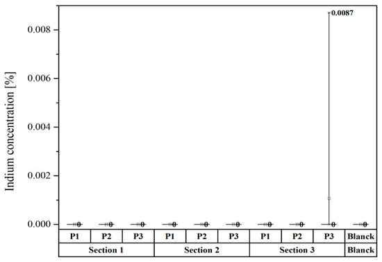 The average fluctuation of the In concentration found within the PP cartridge by the EDS-SEM analysis method is shown in the graph in Figure 17. A single concentration of In was identified, in Sample P3 from Section 3, with an average of 0.87%. Therefore, the concentrations of In and F were insignificant in the whole PP filter cartridge.