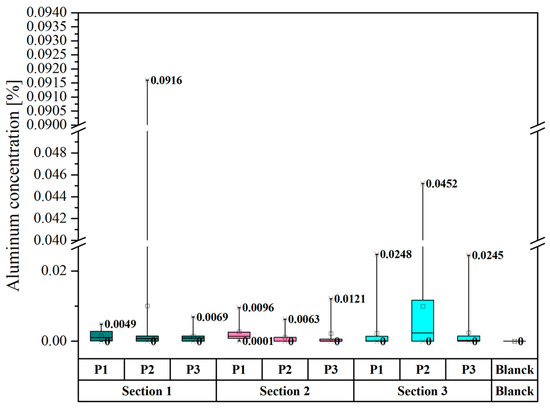 The content of Al in the PP filter material was detected with a maximum average concentration of 9.16% in Sample P2 from Section 1, followed by 0.45% identified in Sample P2 from Section 3. The minimum average value, as can be seen in graph in Figure 18, was detected in Sample P1 from Section 1, with 0.49%, followed by 0.63% in Sample P2 from Section 2. Unlike the other heavy metals identified, the Al content was more representative; this is also evidenced by the variation in the median. This variation showed insignificant upward and downward fluctuations between samples, except for Sample P2 in Section 3, where the median was 0.1%. Another representative observation was also found in the case of the total average determined for each section, where the minimum value was found in Section 2, with 0.20% Al content. Additionally, Section 3 yielded the highest concentration of the overall median Al content, at 0.49%, while Section 1 found the lowest concentration, at 0.43%.