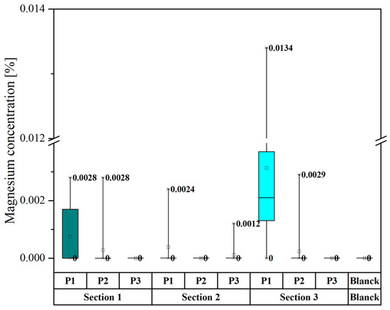 Unlike Al, of which the maximum concentration was detected in Sample P2 from Section 1, at 9.16%, the most significant concentration of Mg was identified in Sample P1 from Section 3, with 1.34%, according to Figure 19. At the same time, the concentration of Mg was lower compared to the concentration of Al, but it did not show smaller variations than Fe and Cu. The total average of Mg content showed minor differences between Sections 1 and 2, with values of 0.03% and 0.02%, respectively. On the other hand, unlike the first sections, Section 3 presented the highest level of the total average, 0.11%. The variation in the median showed a minor fluctuation, whereas Section 3 tended to show an upward direction due to the high Mg content. The fluctuation was minor because the volume of data identified by the EDS analyzer was small.