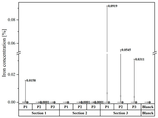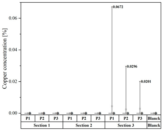 For the cases of Fe and Cu, Figure 20 and Figure 21 show similar variance, with Sample P1 from Section 3 containing the highest concentration of the two metals, followed by Sample P2 from the same section. In the particular case of the variation of the average Fe content, the maximum concentration was identified in Section 3 of sample P1, with 9.19%. The maximum value of the average Fe concentration was approximately similar to the maximum Al concentration, of 9.16%. Instead, the lowest value of the mean was identified in most of the points in Sections 1 and 2, as a result of the low content of Fe in the PP filter material. The variation in the median was maintained both in Section 1 and 2, at a low level of fluctuation, and in Section 3, it increased to 0.65%, where later, as can be seen in the graph from Figure 20, it decreased. The total average of the Fe content varied in tandem with the fluctuation shown in the graph in Figure 20. So, in Section 2, a total average of 0% was obtained, followed by 0.04% in Section 1, and in Section 3 it was determined that the maximum total average was 0.50%.