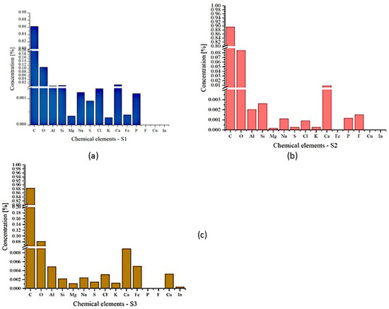 The figure represents the total average of the concentration of impurities identified at the level of each individual section: (a) Section S1, (b) Section S2, (c) Section S3.