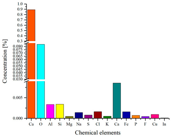 The integral part of the SEM technique, EDS (Energy-Dispersive X-ray Spectroscopy), was used for the chemical analysis of the surface samples taken from the PP filter cartridge. Fifteen chemical elements were identified and analyzed in terms of the content expressed in % using EDS (C, O, Al, Si, Mg, Na, S, Cl, K, Ca, Fe, P, F, Cu, In). The majority of the chemical elements identified in the study were also found in another study that had as its focus the anamnesis of two filter media covered with one layer or five layers, using the ICP-OES technique [23]. The contents of these chemical elements in solid suspensions have been differentiated according to the depth and location of the material, which can be observed in the graphic analysis of each individual element. At the same time, for the most accurate precision of data regarding the contents of chemical elements resulting from the EDS analysis, 10 points per sample were selected. The obtained data were later processed using the calculation of the arithmetic mean for each identified chemical element.