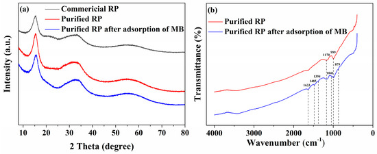 XRD patterns of (a) commercial RP purified RP before and after adsorption of MB and (b) FTIR spectra of purified RP before and after adsorption of MB. Conditions: the concentration of MB = 90 mg/L, the volume of MB solution = 100 mL, the weight of purified RP = 40 mg, the absorption time = 48 h, T = 298 K, pH = 7.