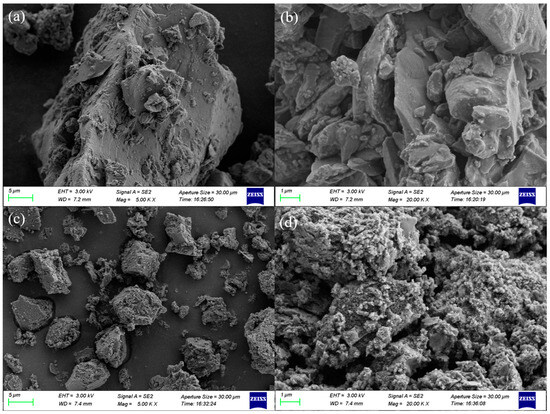 The SEM images of commercial RP and purified RP are shown in Figure 2. Commercial RP showed a low-porous surface with irregular particles (Figure 2a,b). Compared to commercial RP, purified RP has a more compact surface with cavities and ledges (Figure 2d), with the main size being ~10 μm (Figure 2c). Furthermore, the size and shape of pores were also different between commercial RP and purified RP. The specific areas of commercial RP and purified RP were also measured by N2 adsorption/desorption isotherms. Compared to commercial RP, the nitrogen adsorption–desorption isotherms of purified RP were type IV (BDDT classification) isotherms with type H3 hysteresis loops at a relative pressure of 0.6–0.9, which indicated the presence of mesoporous structures in the materials (Figure S3). The area of commercial RP (0.02 cm3/g) was lower than that of purified RP (5.27 cm3/g). These conclusions suggested that, compared to commercial RP, purified RP has a higher adsorption capacity.