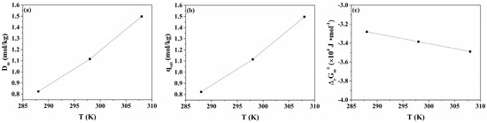 The effects of different temperatures on Dm are presented in Figure 3a. As the temperature increased from 288 to 308 K, the Dm of purified RP for MB increased from 0.824 to 1.497 mol/kg. As the temperature increases, the mobility of MB molecules increases, which can promote the interaction of MB with the main adsorption receptor sites on the surface of purified RP. Thus, the Dm of purified RP for MB increases with the increase in temperature.