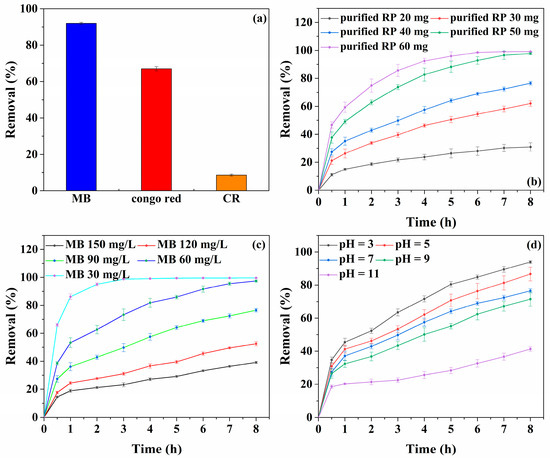 Effects of different dyes (MB, CR and anionic dyes were selected) on removal. (a) Conditions: the concentration of dye = 90 mg/L, the volume of dye solution = 100 mL, the weight of purified RP = 40 mg, T = 298 K, pH = 7. Effect of purified RP dose on removal. (b) Conditions: the weight of purified RP = 20, 30, 40, 50 and 60 mg, the concentration of MB = 90 mg/L, the volume of MB solution = 100 mL, T = 298 K, pH = 7. Effect of MB concentration on removal. (c) Conditions: the concentration of MB = 30, 60, 90, 120 and 150 mg/L, the volume of MB solution = 100 mL, the weight of purified RP = 40 mg, T = 298 K, pH = 7. Effect of pH on removal. (d) Conditions: pH = 3, 5, 7, 9 and 11, the concentration of MB = 90 mg/L, the volume of MB solution = 100 mL, the weight of purified RP = 40 mg, T = 298 K.