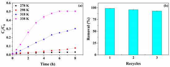 Effects of different temperatures on MB desorption. (a) Conditions: T = 278, 298, 318 and 338 K, the concentration of MB = 90 mg/L, the volume of MB solution = 100 mL, the weight of purified RP = 40 mg, pH = 7. Recycles of purified RP for the adsorption of MB. (b) Conditions: the concentration of MB = 90 mg/L, the volume of MB solution = 100 mL, the weight of purified RP = 40 mg, T = 308 K, pH = 7.