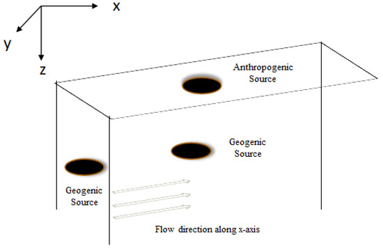 Source nature: Two types of sources have been considered; namely, anthropogenic and geogenic sources. The source of constant strength originates at the surface of the different planes of the aquifer for geogenic sources, but for anthropogenic sources, contaminant enters into the system through the upper plane (Figure 1). The source’s strength is at its peak at the exact point of occurrence and gradually diminishes as the distance from that point increases.