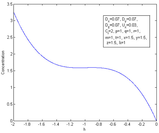 The convergence control parameter is an essential parameter to find for any semi-analytical solution. The convergence of the solution using HAM is entirely dependent on the convergence control parameter . Therefore, we must first analyze the convergence of the present model’s solution. From this graph (Figure 2), we can predict the range of h where the solution will become stable. The contaminant concentration vs. h curve has been plotted via keeping concentration fixed at point and fixed time as . By analyzing Figure 2, we can identify a specific position where the concentration aligns parallel to the h-axis. The values of at this position can be utilized as the convergence control parameter.