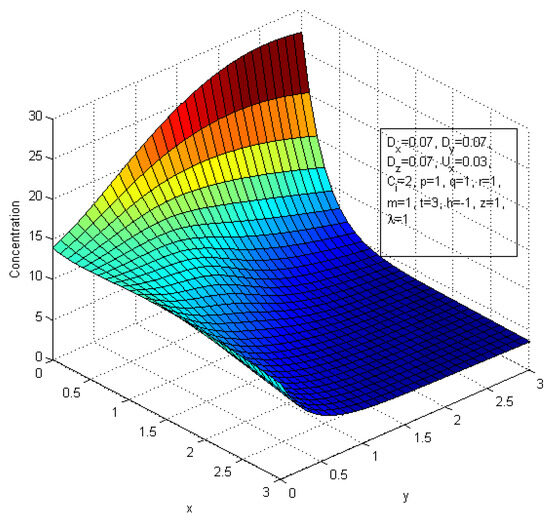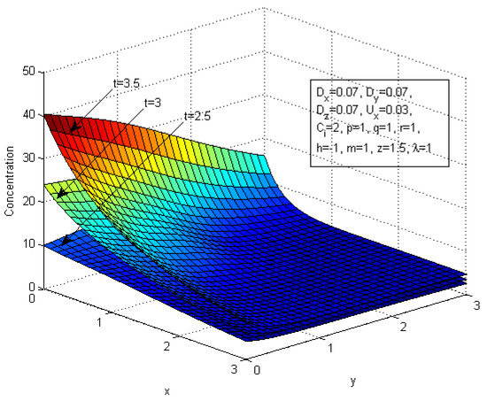 Figure 5 shows the distribution profile of contaminant concentration against the x- and y-axis. The illustration showcases the influence of a human-induced source positioned at a particular point, , on the plane. It maintains a consistent value of , a fixed source intensity of , and different time values of t. The concentration profiles begin at distinct values of 10 units, 24 units, and 40 units for specific time intervals of 2.5 units, 3 units, and 3.5 units, respectively (Figure 5). However, as the distance increases, these concentrations gradually decrease and approach zero asymptotically. It is clear from the figure (Figure 5) that contaminant concentration increases with time. If the anthropogenic source of contamination is continuously active, then the concentration of contaminants within the aquifer will steadily increase over time at a specific location.