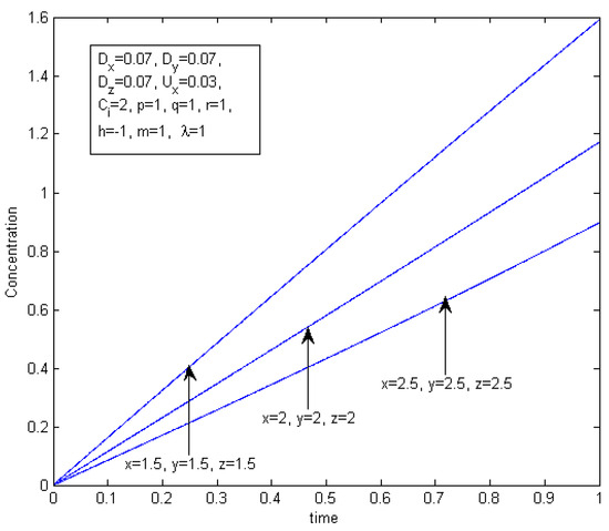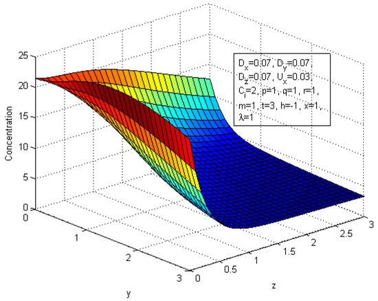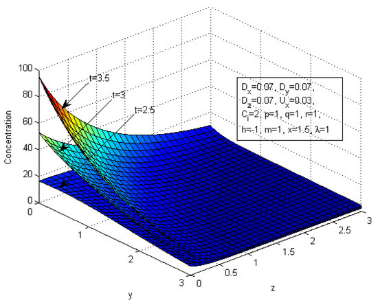 The graph in Figure 6 shows the distribution of contaminant concentration along the y- and z-axis. This is for a fixed value of and fixed source strength of , while the natural source is located at point on the plane. The concentration profiles begin at distinct values of 18 units, 50 units, and 95 units for specific time intervals of 2.5 units, 3 units, and 3.5 units, respectively (Figure 6). However, as the distance increases, these concentrations gradually decrease and approach zero asymptotically. It is also clear from the figure (Figure 6) that contaminant concentration increases with time. As such, it is obvious that if the natural source of contamination is continuously active, then the concentration of contaminants within the aquifer will steadily increase over time at a specific location.