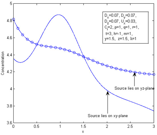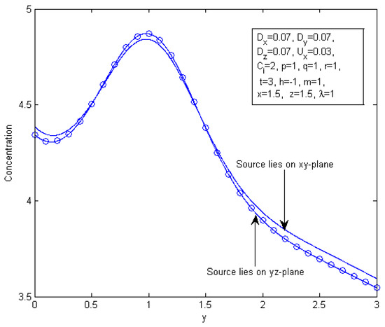 In Figure 8, we compare the contaminant concentration distribution against the -axis when an anthropogenic sources lies on the -plane and a natural source lies on the -plane, wherein the anthropogenic source occurs at the point and the natural source which occurs at the point . Figure 8 illustrates two comparable distributions of contaminant concentrations for both the anthropogenic and natural sources. Contaminants from natural sources start with lower concentrations than those from human activities, but they gradually increase and eventually surpass them. However, after reaching a maximum at y = 1, they start to decline and ultimately finish below the contaminant concentration of the anthropogenic source at y = 3.