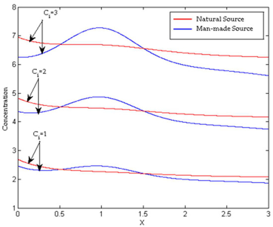 Contaminant concentration distribution profile against the -axis when an anthropogenic source lies on the -plane and a natural source lies on the -plane.