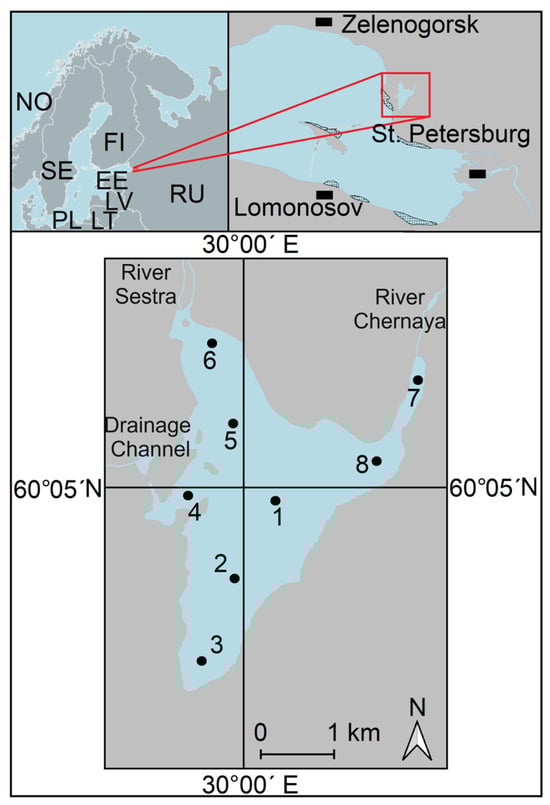 The Sestroretsky Razliv reservoir is located in the northwest of Russia, on the northern shore of the Neva River estuary in the northeastern part of the Baltic Sea region (Figure 1). It belongs to protected nature conservation zones, and the use of civilian motorized water transport is prohibited in its waters. The area of the reservoir is 10.3 km2. The bottom is relatively flat, and depths do not exceed 1.5–2.5 m in the main part of the reservoir. The watershed of the reservoir covers an area of 566 km2 and is drained by the Sestra and Chernaya rivers. The water level has been maintained at approximately the same level since 1991, with excess water discharged through a drainage canal into the Neva Estuary.