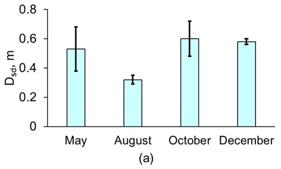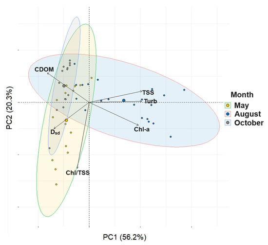 The principal component analysis (PCA) revealed that Dsd was inversely proportional to Turb, TSS, and Chl-a concentrations (Figure 4). The relationship between Turb, TSS, and Chl-a concentrations was most pronounced in August (Figure 4), when the Chl-a concentration in the water reached its maximum values, and Turb was also at its highest (Table 1, Figure 2). The concentration of CDOM did not have a relation with Dsd, but the proportion of Chl-a in TSS was positively related to Dsd (Figure 4).