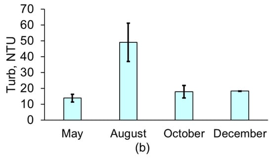Secchi disk depth did not vary significantly and did not exceed 0.8 m in the shallow Sestroretsky Razliv reservoir in May, October, and December; however, in August it was significantly lower (Figure 2a). Water turbidity in May, October, and December ranged from 10 to 20 NTU, while in August it increased to almost 70 NTU (Figure 2b).