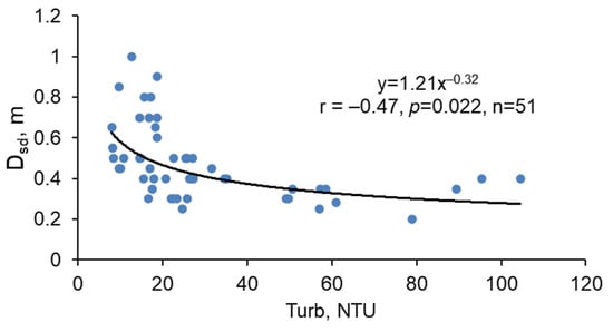 Secchi disk depth demonstrated a power-law dependence on the water turbidity (Figure 3). These two parameters exhibited a statistically significant negative correlation. However, the most significant changes in Dsd were observed at Turb up to 20 NTU. With further increases in turbidity, Dsd remained relatively constant (Figure 3).