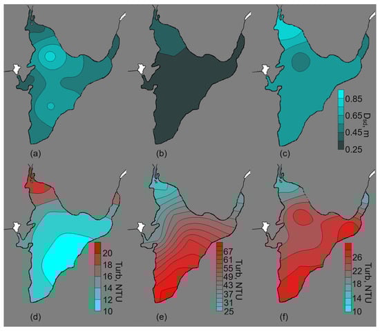 Spatial distribution of Secchi disk depth (Dsd) in May (a), August (b), October (c) and water turbidity in May (d), August (e), and October (f) 2015, 2016 and 2018; data are averaged over all stations. The scale values in (a–c) are the same.