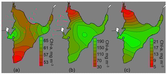 Spatial distribution of chlorophyll-a (Chl-a) concentration in May (a), August (b), and October (c); data averaged over all sampling stations for 2015, 2016, and 2018.