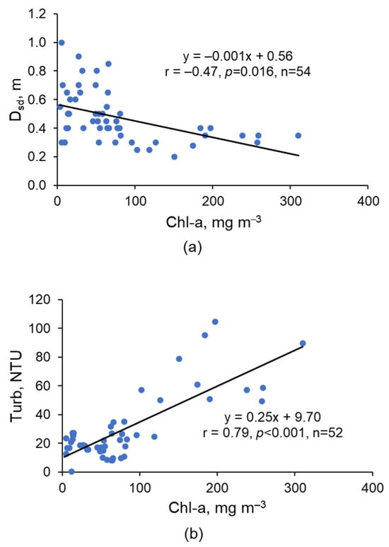 The results of the regression analysis indicated a statistically significant negative relationship between Dsd and Chl-a concentration (Figure 7a). However, the correlation coefficient and statistical significance of the relationship between chlorophyll-a concentration and turbidity were found to be significantly higher compared to those statistics for the relationship between ChL-a and Dsd (Figure 7a,b). The reason for this is that the Secchi disk depth did not change when the chlorophyll concentration increased above 100 mg m−3 (Figure 7a). In contrast, water turbidity increased proportionally with an increase in Chl-a concentration up to 300 mg m−3 (Figure 7b). From the analysis of Figure 7, it follows that a concentration of 100 mg m−3 approximately corresponded to a turbidity of 40 NTU (Figure 7), which was the threshold value above which Dsd ceased to decrease (Figure 3).