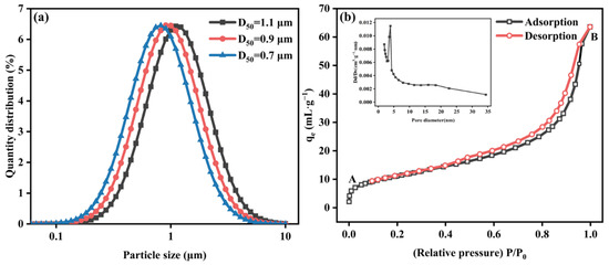 (a) Particle size distribution, (b) adsorption desorption isotherms and pore size distribution of loess colloid particles.