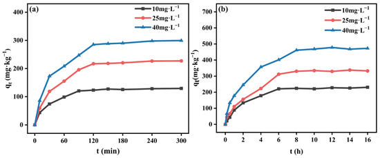 The adsorption kinetics curves of aniline and TNT on loess colloid particles are described in Figure 2. As the adsorption time increased, both organic compounds exhibited the trend of “an initial rapid increase in adsorption, followed by stabilization at adsorption equilibrium” [40]. Adsorption processes of aniline and TNT reached equilibrium at 120 min and 8 h, respectively. The results showed that when initial concentrations of the organic compound were 10, 25, and 40 mg·L−1, the aniline adsorption capacity were 120.84, 217.00, and 285.28 mg·kg−1 (Figure 2a), respectively. Correspondingly, the TNT adsorption capacity was 220.67, 334.28 and 468.39 mg·kg−1 (Figure 2b). These results suggested that the adsorption capacity of TNT on loess colloid particles was greater than that of aniline. The disparity in adsorption between TNT and aniline can be attributed to the presence of a certain amount of TOC (0.122%) in loess colloid particles (Table S6) and the logarithm of octanol–water partition coefficient (log Kow). TNT has a higher log Kow value (1.6) compared to aniline (0.94), making it easier for TNT to dissolve into the particles through partition. Furthermore, the adsorption capacity of both organic compounds increased with rising initial concentration, the reason being that a higher initial concentration could form a large concentration difference to provide the driving force for the adsorption process.