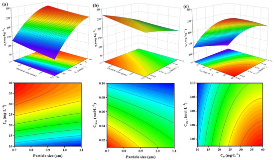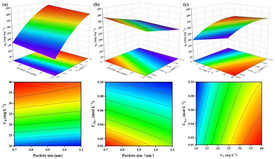 Three-dimensional response surface and contour diagrams of TNT adsorption capacity under interaction: (a) particle size and initial TNT concentration, (b) particle size and Na+ concentration, (c) initial TNT concentration and Na+ concentration. The color of the surface represents the adsorption capacity. Blue, green, and red indicate that the adsorption capacity of TNT increases sequentially.