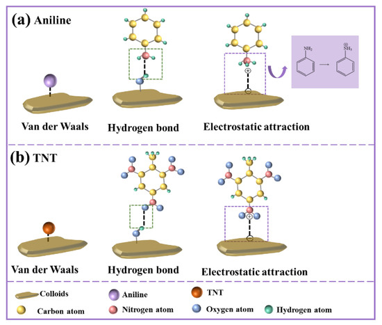 Adsorption mechanism of (a) aniline and (b) TNT on loess colloid particles.
